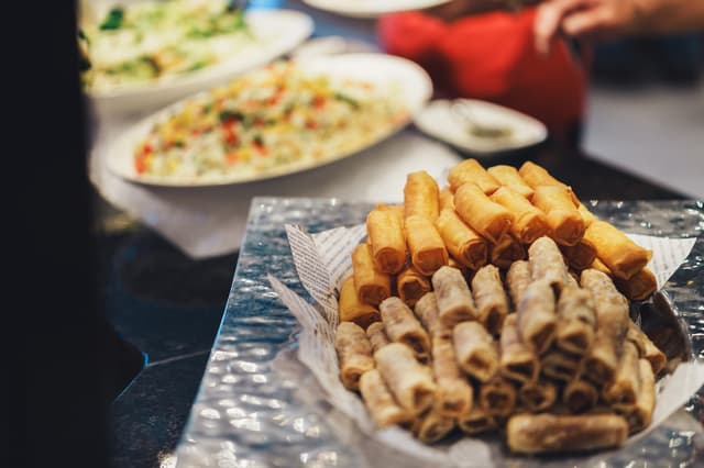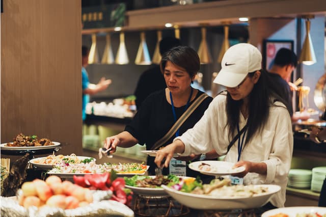 海、陸鮮味一網打盡:現切生魚片、現蒸螃蟹、嫩煎菲力牛排、港點、沙拉吧、現做義大利麵……每個餐檯皆由五星主廚坐鎮,保證食材新鮮、多樣。兒童餐區亦有親子愛的小熱狗、炸薯條與水果拼盤。 -