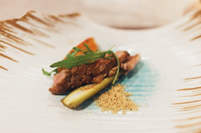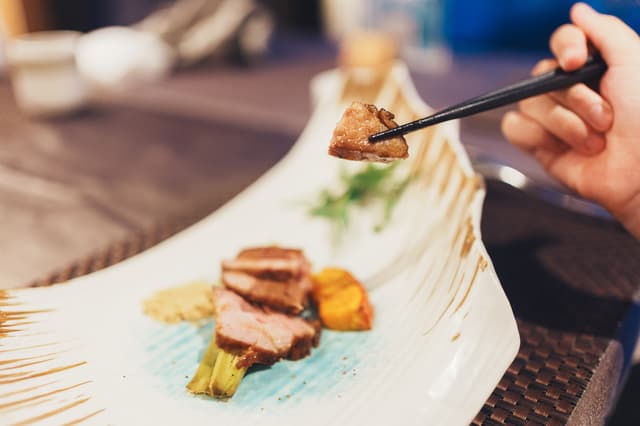 主廚現場烹調,日本 A5 和牛、水果豚與時令海鮮,佐以宜蘭在地蔬菜,吃得到食材原味與工法巧思。