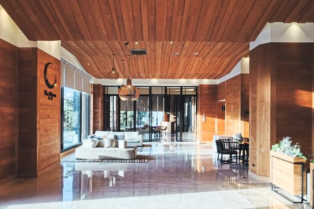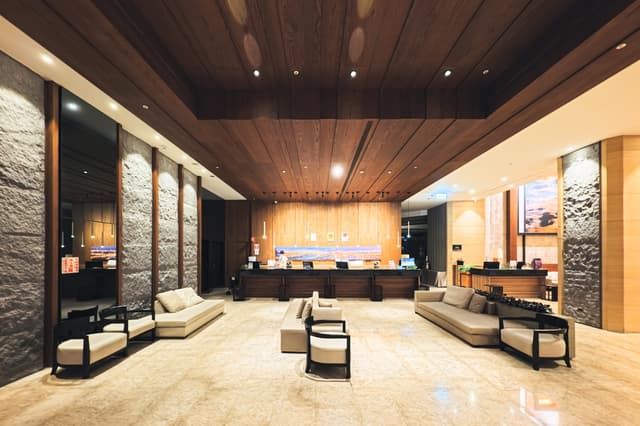 大廳空間採用極簡日式設計:寬闊的淺木地板、低調的石材牆面,加上大片落地窗引入的自然光,宛如置身於一座現代禪意美術館。角落擺放的在地藝術品,結合了蘭陽平原的稻穗造型與木紋紋理,照映出宜蘭人文與自然的共生。入住手續在柔和燈光中完成,伴隨著輕柔古箏樂曲,為一趟療癒旅程拉開序幕。