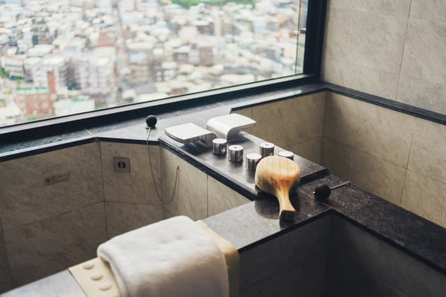 雙湯池設計:房內左右各設一座湯池,分別為碳酸氫鈉美人湯與寶石沐浴晶鹽浴。前者泉質透明無味,富含礦物質,泡完肌膚光滑細緻;後者則蘊含喜馬拉雅玫瑰鹽,溫熱中帶有一抹淡雅香氣,洗去疲勞、滋養身心。更特別的是,雙湯池均面向落地窗,泡湯時可同時享受窗外壯闊景致,給人一種身心與天地融合的無邊開闊感。