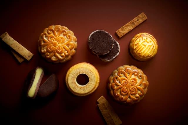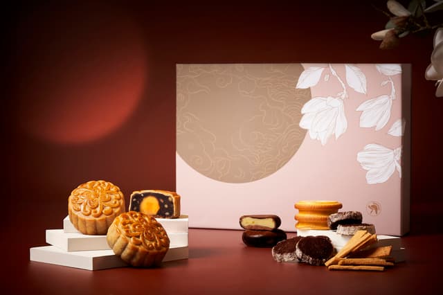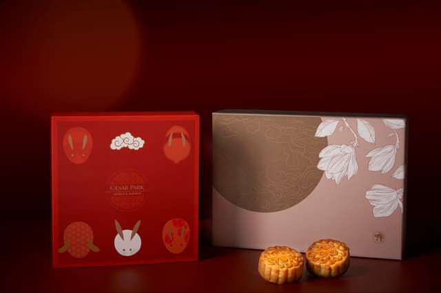 凱撒飯店連鎖「雅月澄心禮盒」,盒身設計以2025年PANTONE年度代表色「摩卡慕斯」為概念,再運用乾燥玫瑰粉與典雅木蘭花點綴,加上柔和映月意象,打造內斂優雅的視覺風格。禮盒內結合中、西與日式月餅及點心,包含廣式月餅「蓮蓉蛋黃」、「烏豆沙松子蛋黃」兩款,及「巧克力鑽石餅」、「甘藷酥條」、「年輪蛋糕」與「栗子蛋糕」四款精選甜品。其中「蓮蓉蛋黃」選用鹹香蛋黃與淡雅清香白蓮蓉,內餡絲滑細緻,兼具傳統與雅緻的滋味。「烏豆沙松子蛋黃」將慢火熬製豆沙加入特級松子,帶出堅果獨特香氣,甜而不膩。酥脆爽口的「甘藷酥條」嚴選台灣在地炭烤地瓜、特級奶油與麵粉製成,帶有地瓜香氣。