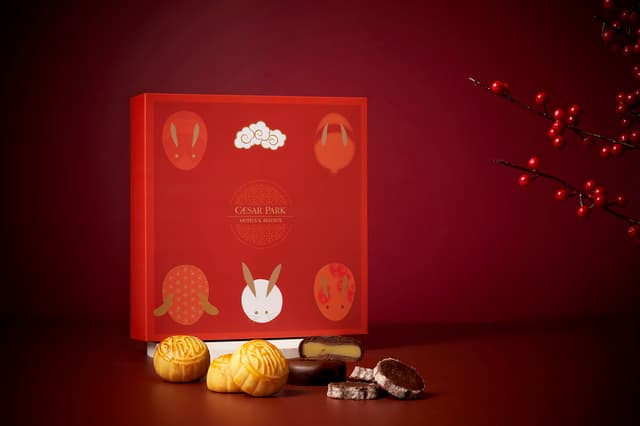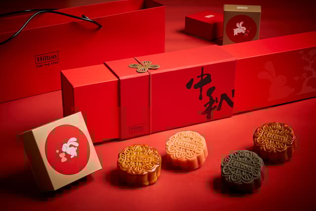 此外,台北新板希爾頓酒店獨家推出「皓月相伴禮盒」,以傳統中式美學為主軸,選用喜慶的紅色作為主色調,融入「月下兔影」系列元素,將萌兔化身為中秋故事的說書人,置身於皎潔月下賞花、搗藥、品茗、戲秋,生動描述出溫馨趣味的節日場景,傳遞中秋團圓祝福與共享的喜悅氛圍。盒內包含兩款廣式經典月餅「豆沙蛋黃」、「烏龍核桃」,與兩款特色桃山月餅「紅心芭樂桃山月餅」、「芝麻桃山月餅」,及英國JING TEA茶包「南非國寶茶」、「伯爵茶」兩款精選茶作搭配。其中「紅心芭樂桃山月餅」嚴選產自高雄燕巢的紅心芭樂與白豆沙融合製成清爽果香內餡,口感柔和細緻,預訂可洽02-2958-3975。