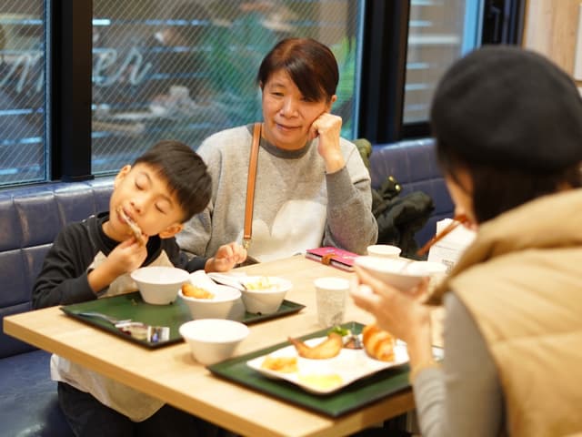 媽媽平常早餐吃得很清淡,這裡的有機沙拉和日式煮物非常合她的胃口;而兒子則對新鮮出爐的可頌麵包愛不釋手。