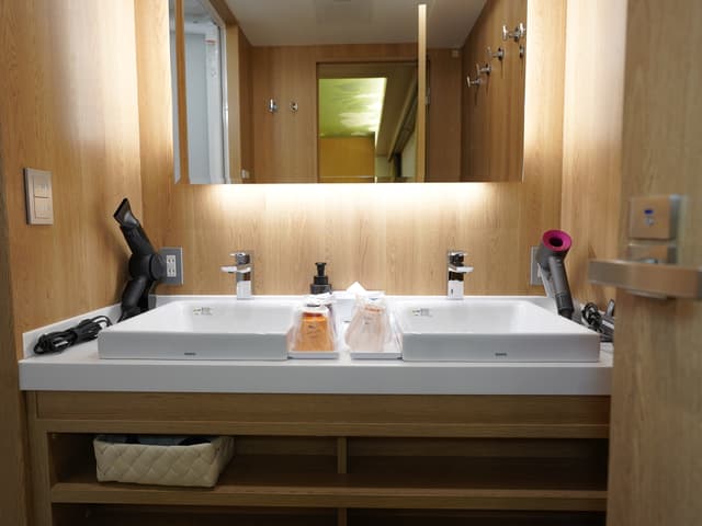 更棒的是,它配置了雙人可同時使用的寬大梳妝台,甚至貼心準備了兩支吹風機。早上出門前,太太在化妝、媽媽在吹頭髮、兒子在刷牙,動線流暢互不干擾,大大提升了整裝效率,省下旅行中最昂貴的時間成本。