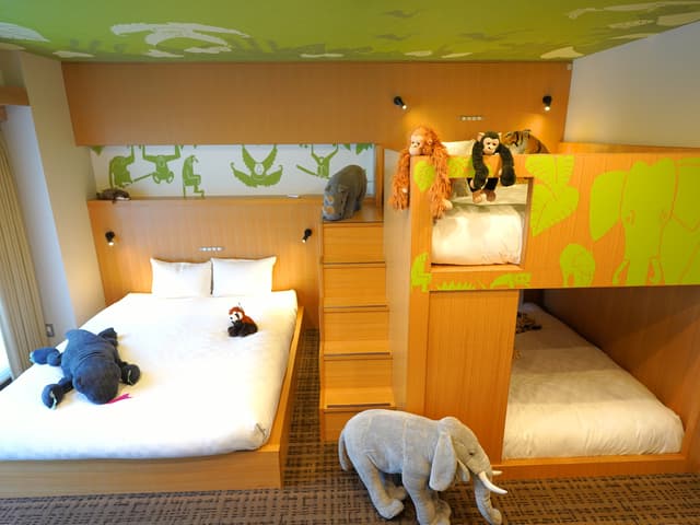 視覺驚喜: 房間以柔和大地色為主調,牆面繪有森林與草原意象。最讓孩子瘋狂的是散落在角落與床鋪上的動物玩偶——長頸鹿、老虎、花豹、大象……兒子興奮地蹦蹦跳跳,彷彿我們今晚就住在動物園裡。