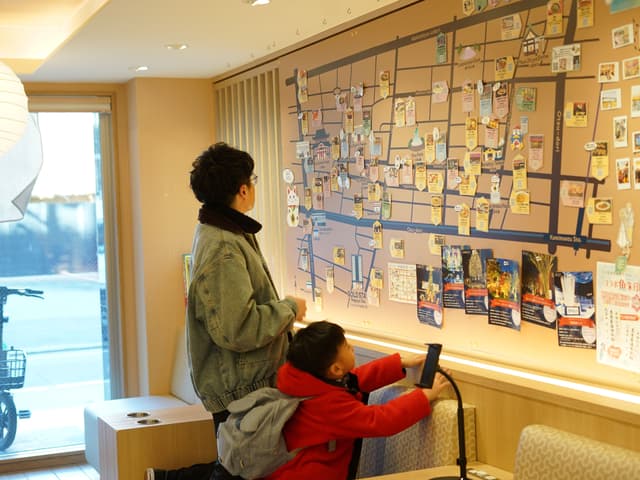 大廳設有舒適的座位區與服務櫃台,最讓我驚喜的是牆上那幅「周邊旅行地圖」。畫風可愛、資訊實用,標註了許多連在地人都推薦的隱藏美食,連五歲的兒子都能看圖索驥。