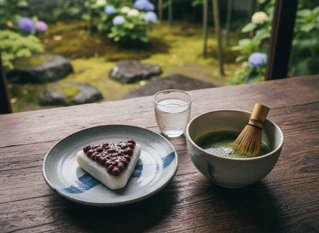在六月造訪任一間面對庭園的茶屋,點一份「水無月」搭配熱抹茶。體驗口中冰涼軟糯與窗外淅瀝雨聲形成的寒暖對比。