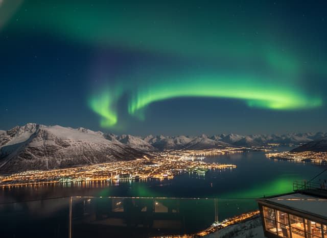 特羅姆瑟是極光帶上生活機能最完善的城市,擁有北大西洋暖流調節的溫和氣候。推薦搭乘 Fjellheisen 纜車登頂,俯瞰極光倒映在峽灣海面的絕景。這裡適合不想犧牲舒適度,又想兼顧購物與美食的初次追光者。