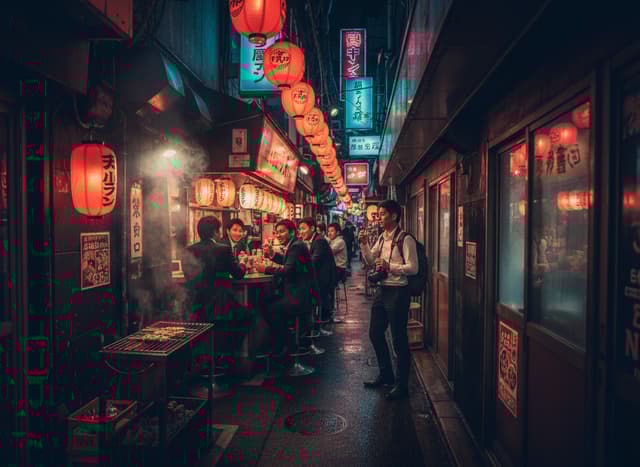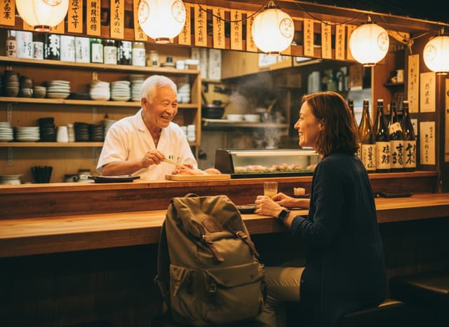 晚上前往「立吞(站著喝)」酒吧。站立的姿勢會物理性地拉近人與人的距離,點一杯 Highball,觀察並加入鄰座的對話是獨旅者最自然的社交方式。