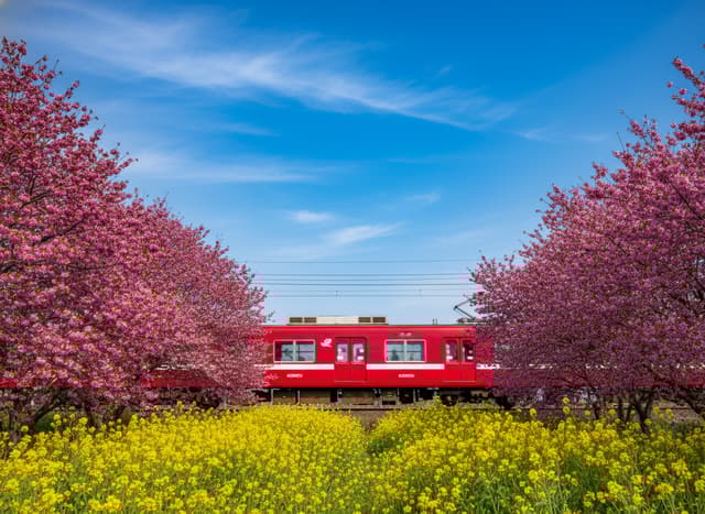 東京一小時圈內的最佳替代方案。鐵道旁濃豔的河津櫻與金黃油菜花同時盛開,色彩對比強烈。利用京急電鐵套票,賞花後順道前往三崎港品嚐頂級鮪魚,是一條兼具視覺與味覺的大人系路線。